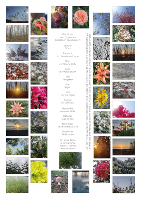 Die Vervielfältigung der Kalenderblätter und Zitate ist nicht erlaubt ohne die ausdrückliche Zustimmung der Herausgeberin Inelle C. Fuxius. Texte und Fotos sind urheberrechtlich geschützt.